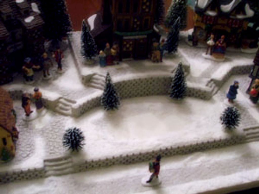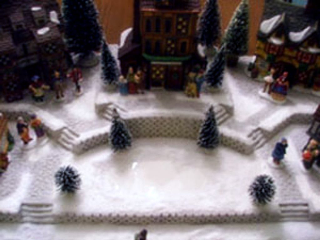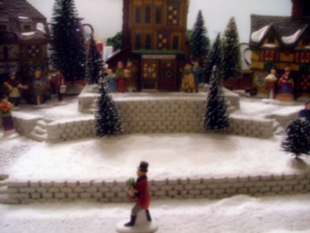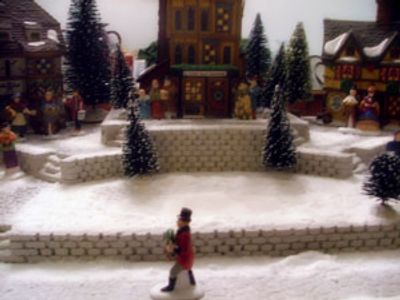 In the center is a frozen pond, which is hand made. It is tinted to resemble ice, some parts blue, other parts white (the picture shown on this page have an all white pond), and has piles of snow around the edge. Behind the pond is the brick/stone wall.