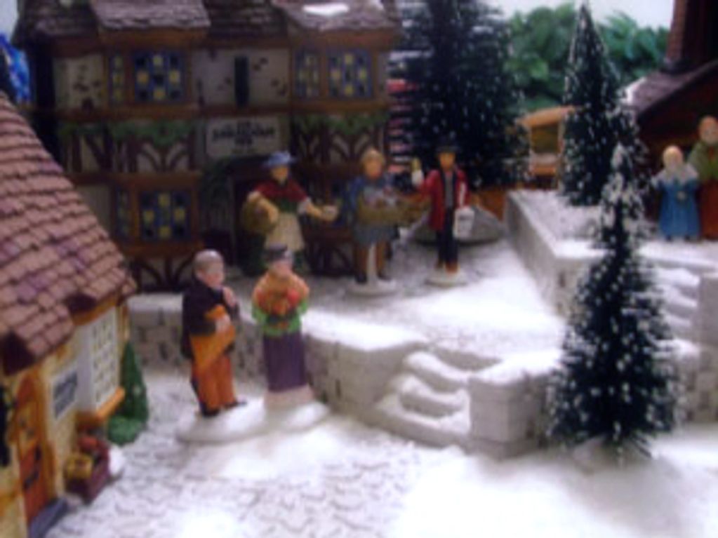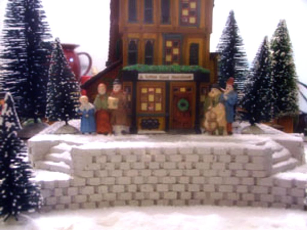 The pathways, staircases, walls, and area around the building are all hand-carved, and painted. The walls have a slightly aged look, which is perfect for Christmas. There is snow on parts of the stairs, walls, and pathways. We sprinkled some of the snow on top of the cobblestone to give it a wonderful winter look.