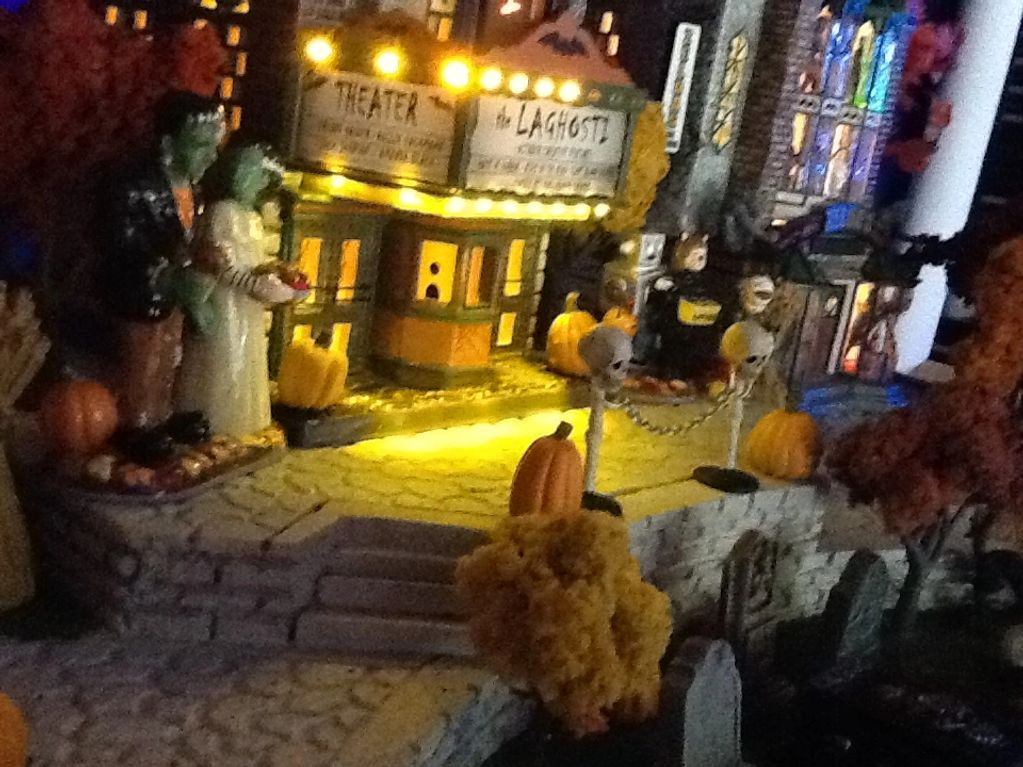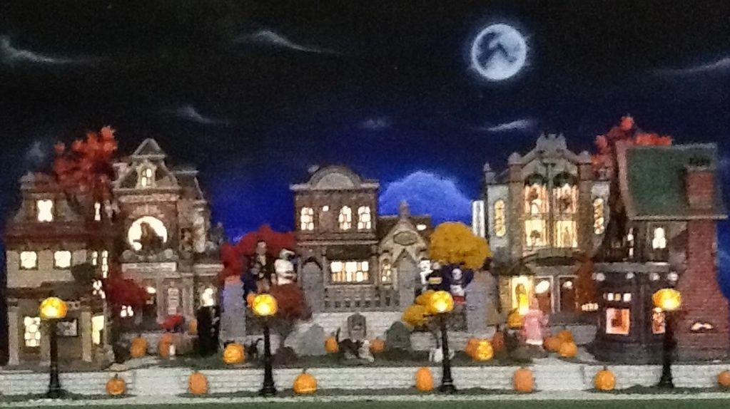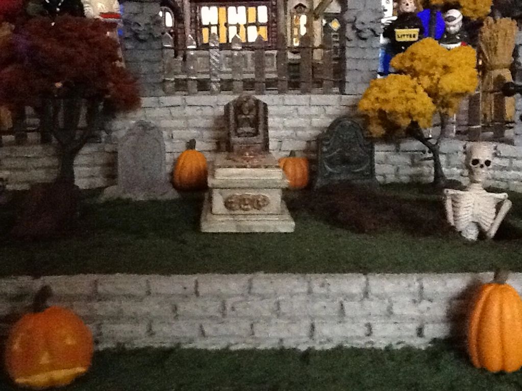 Cauldron’s Court is one of our most popular displays and is designed as a town square with room for five buildings. A cobblestone pathway leads you up past each of the buildings on one side, then down to the other side. In the center of the display with the stone wall as the backdrop, there is a small cemetery. Using the concept from our “Open Grave Cemetery” display, there are five graves, each of which can assume one of 4 positions:
